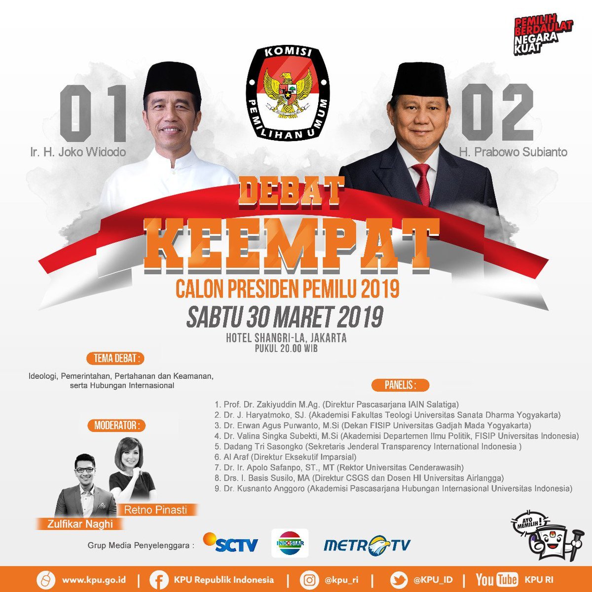 Panelis Debat Capres ke-4 di Pilpres 2019 berikutnya, yakni Dadang Tri Sasongko (Sekjen Transparency International Indonesia), Al Araf (Direktur Eksekutif Imparsial), Dr Ir Apolo Safanpo ST MT (Rektor Universitas Cenderawasih), Drs I Basis Eko Soesilo MA (Akademisi/Pengajar HI Fisip Unair dan Direktur Centre for Strategic and Global Studies/CSGS), dan Dr Kusnanto Anggoro (Akademisi/Pengajar Fisip UI).